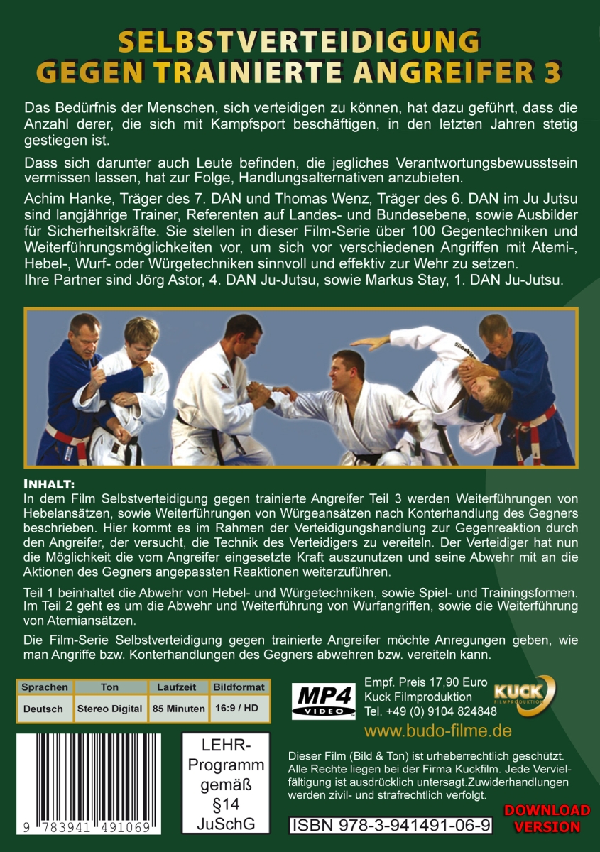 In dem Film Selbstverteidigung gegen trainierte Angreifer Teil 3 werden Weiterführungen von Hebelansätzen, sowie Weiterführungen von Würgeansätzen nach Konterhandlung des Gegners gezeigt. Hier kommt es im Rahmen der Verteidigungshandlung zur Gegenreaktion durch den Angreifer, der versucht, die Technik des Verteidigers zu vereiteln. Der Verteidiger hat nun die Möglichkeit die vom Angreifer eingesetzte Kraft auszunutzen und seine Abwehr mit an die Aktionen des Gegners angepassten Reaktionen weiterzuführen.