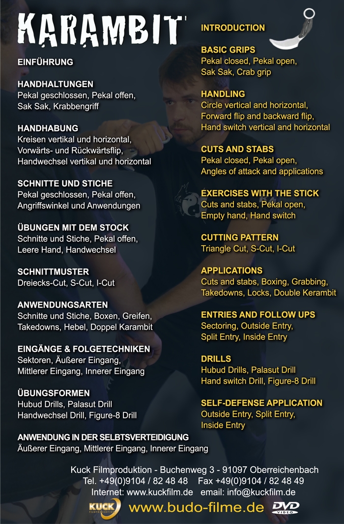 Part one of our multipart series shows the art of fighting with the Kerambit. The Kerambit is a sickle knife of South-East Asia. Typical for this knife is the curved edge and the ring at the end of the grip. In the intro we talk about some theoretical aspects of the Kerambit and follow up with the practical use of it. Starting with basic techniques (handling, stabs, slashes and combinations) we move to exercises with a partner (inside-, split-, outside entry and follow ups), drills, applications and their transfer into self-defense scenarios.