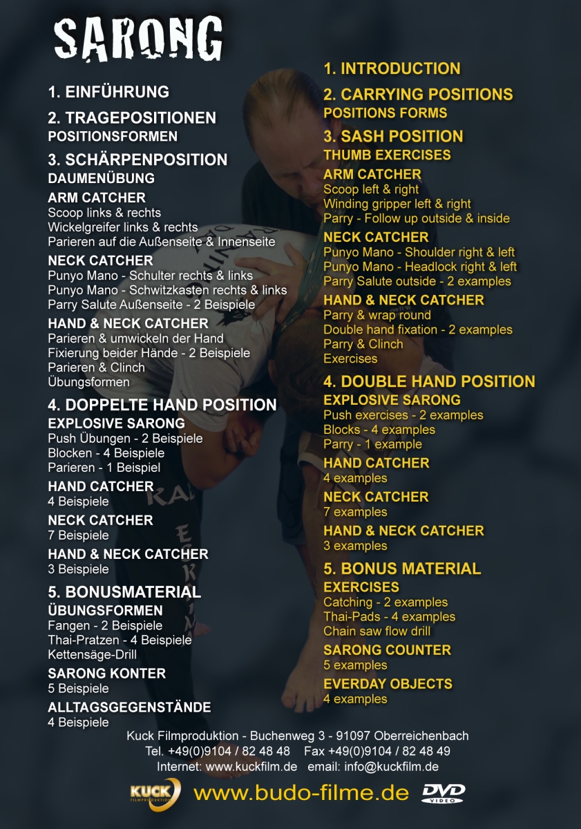 Part three of our multipart series shows the art of fighting with the sarong or malong. The sarong is a traditional garment in many parts of Southeast Asia and comes in different colors and designs. It is worn mostly by men and still used today. When worn the sarong it is wrapped around the hips like a skirt, but it can also function as a bag or hang over the shoulder like a sash. Already in the 13th century the piece of cloth was used as a weapon by the so called Thugee brotherhood in India who robbed travelers. In this video you will see techniques with the sarong to manipulate, to throw, to lock and to strangulate an attacker. We use a scarf which is sewn together at the ends. Many of the techniques could also be applied by using a different long, flexible object like a belt, a towel or a carrying strap of bag. At the beginning the focus will be on the carrying positions of the sarong and the transitions to the different positions. The following part will demonstrate techniques and applications in the sash position. First we will show different ways to catch and fix the attacking arm with the sarong. After that you will see counterattacks to the throat followed by techniques to fix the arm and the throat at the same time to take out the attacker. After the sash position we move on to the double hand position. Here you will see explosive sarong techniques and different ways to catch the hand, the throat or both at the same time. To train the techniques and applications more intense we created some exercises and drills which we also show in this film.At the end we will demonstrate a few techniques on how to counter the sarong and how to transfer the sarong techniques to everyday objects.